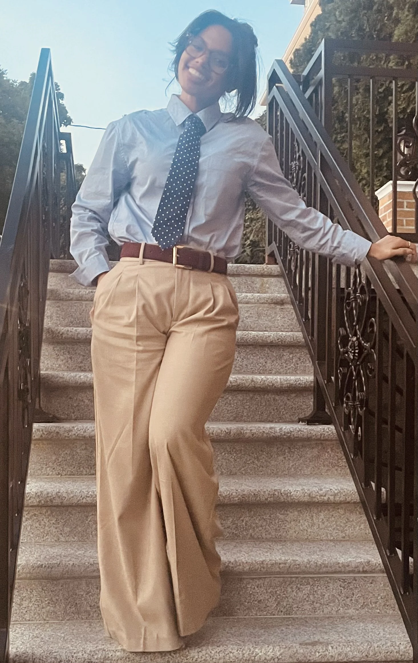 Today I thought Busy chic, New York energy vibes. So we are full on giving menswear a try. Love it, will I ever do it again! Of course!! Maybe without a tie, or with a tie! Iβll change it up next time! Who knows, but I wanted to try something different. I legit wanted to loosen my tie all day! But itβs a look, so we are doing this OKAY!! If you listen to a podcast called the giggly squad! This is giving full Hannah Berner! Which love her by the way!! All month long we have been moving an shakin!! And getting things done !! Today I have been in a uber, On a train ,Back in a uber and honestly back on a train again.. I have been making sure to get my steps in for sure! I just wanted to change the style this week! And Make it very newyork chic!